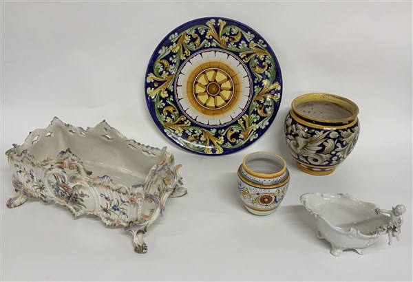Lotto composto da due centrotavola, due vasetti e un piato decori a grottesche e motivi floreali (misure diverse)
