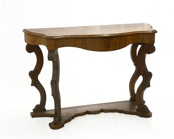 Consolle di forma sagomata ad un cassetto, gambe sagomate poggianti su pianetto, fine sec. XIX (cm 124x83x54) (difetti e mancanze)
