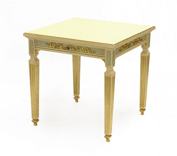Tavolino quadrato in legno laccato avorio e oro con cassetto, gambe rastremate e scanalate (cm 70x70x70) (difetti)