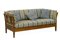 Antico divano in legno a tre posti con sponde a giorno decorate da cartelle intagliate, cuscini rivestiti con tessuto a righe (cm 196x77x81) (difetti e restauri)