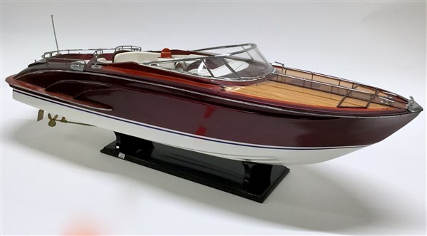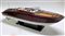 Modellino di motoscafo in legni vari, metallo e sedute in finta pelle (l cm 97) (difetti)