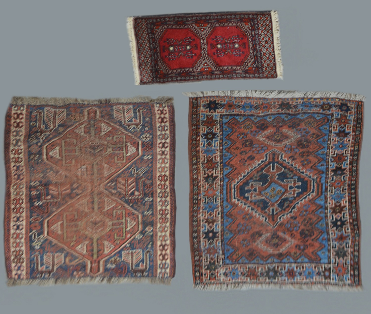 Lotto di tre tappeti orientali di varie fogge e dimensioni (il più grande cm 126x81) (difetti)