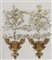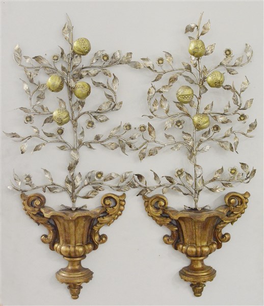 Coppia di fregi a forma di vasi biansati in legno intagliato e dorato con rami di melograno fioriti in metallo argentato (cm 38x102) (lievi difetti)
