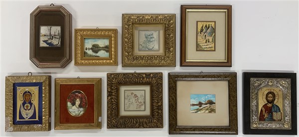 Lotto composto da quattro piccoli multipli su lamina d'argento, due piccoli dipinti ad olio, due icone moderne ed una miniatura ovale di autori, misure e soggetti diversi in cornice (difetti e mancanze)