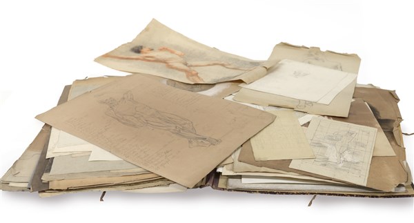 Cartelletta contenete numerosi disegni e bozzetti con misure e soggetti diversi alcuni firmati (difetti e mancanze)