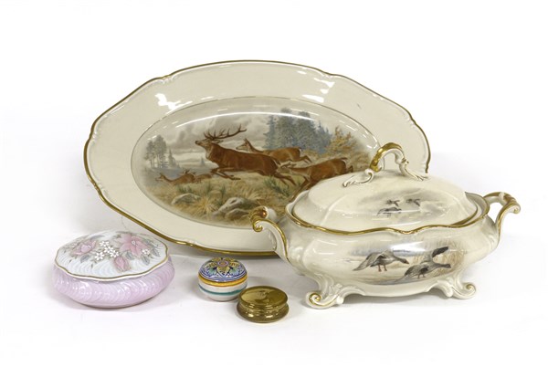 Lotto composto da una zuppiera con vassoio in ceramica di manifattura tedesca e tre scatole di manifattura e materiale differente (difetti)