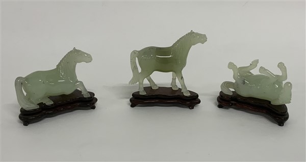 Lotto di tre sculture in pietra dura raffiguranti cavalli (h. cm max 8) base in legno. Cina, sec. XX (difetti e restauri)