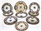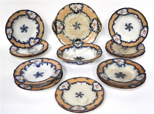 Manifattura del secolo XIX. Parte di servizio da tavola in ceramica decorata a mazzi fioriti entro riserve in blue e oro. Composto da dodici piatti, un vassoio biansato e una ciotola (difetti e restauri)