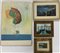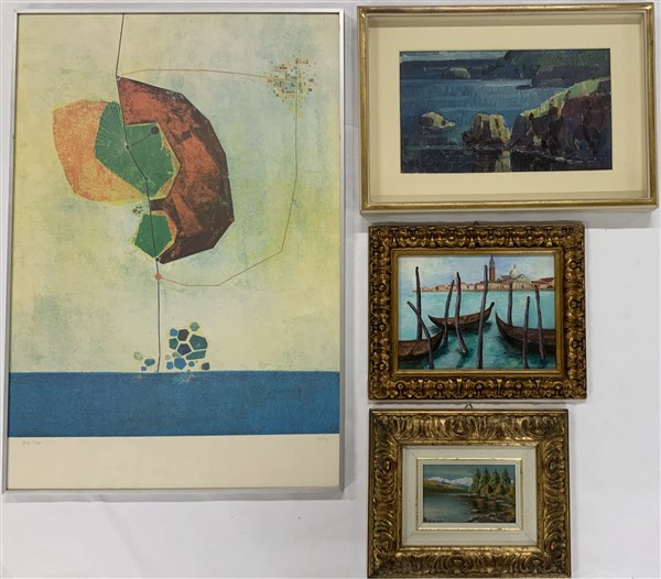Lotto composto da tre dipinti raffiguranti paesaggi, di autori e misure diverse unite ad una litografia a colori di Maurizio Alba