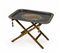 Vassoio in latta dipinto a paesaggio invernale al centro entro volute dorate, secolo XIX (cm 70x54) poggiante si trespolo rivestito in velluto (difetti)