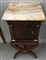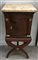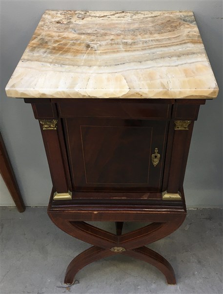 Coppia di comodini in mogano filettati in legno chiaro. Anta tra colonne, sormontata da cassetto. Gambe a "X" unite da traversa tornita. Piano in onice (cm 35x79x33) (difetti)