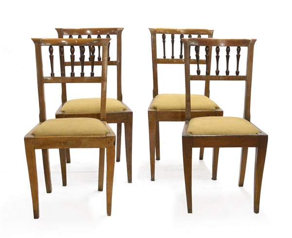 Gruppo di quattro sedie in noce con schienale a colonnine tornite, gambe a scia