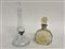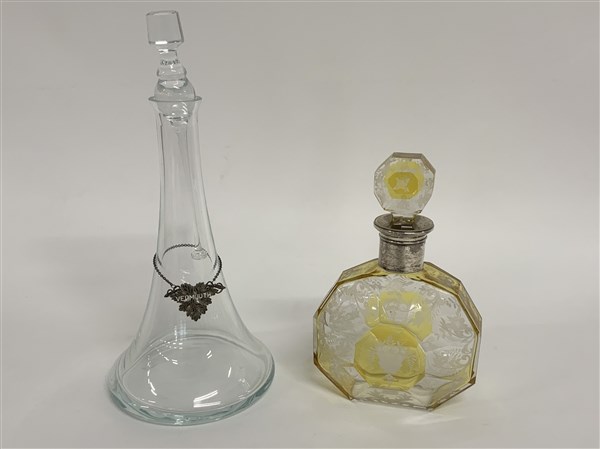 Lotto composto da una bottiglia con tappo in cristallo di boemia ghiera in argento e una in cristallo di forma conica (cm h max 39) (difetti)