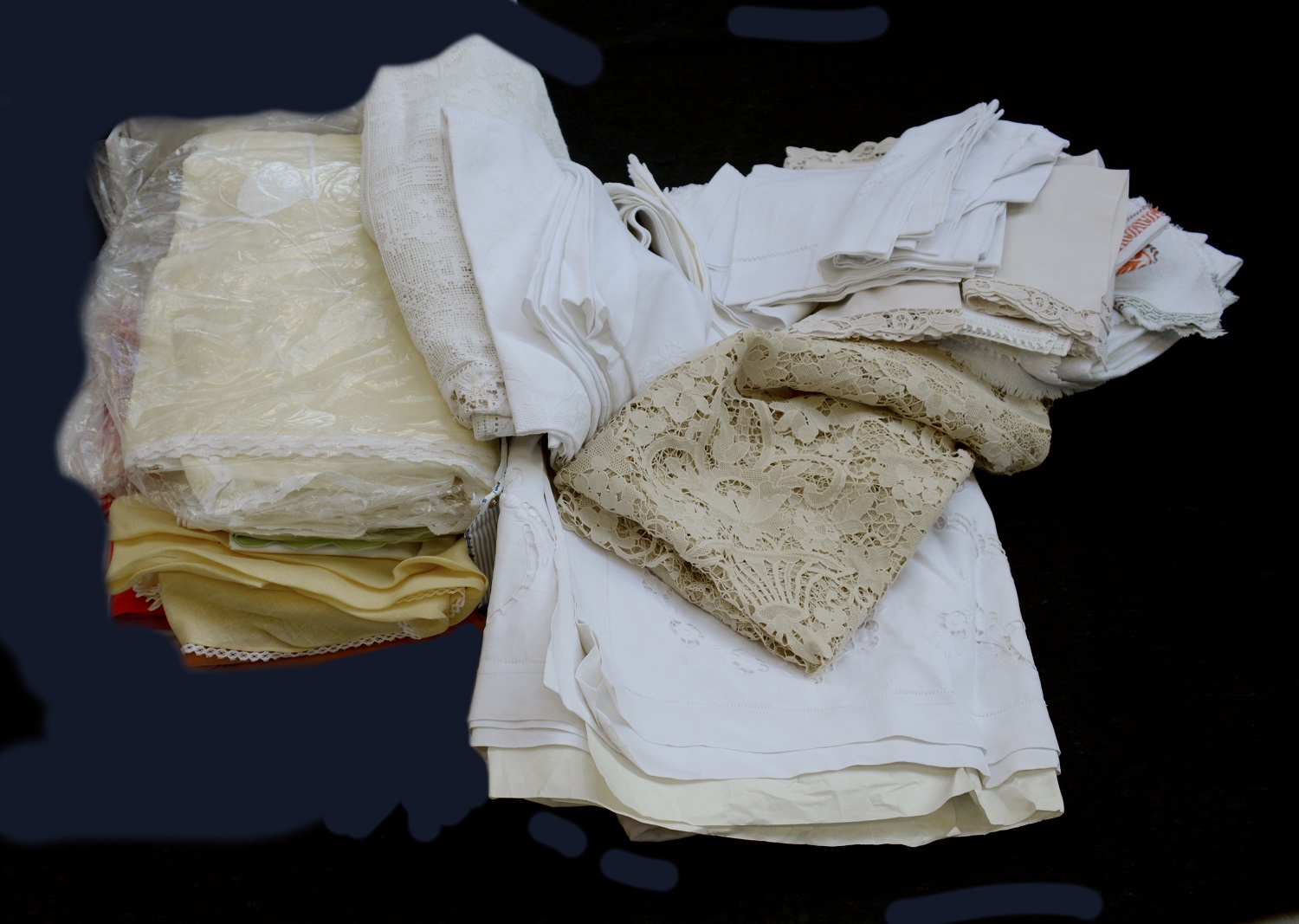 Cartone contenente numerose tovaglie con tovaglioli in organza di cotone, pizzo al tombolo e filet