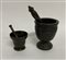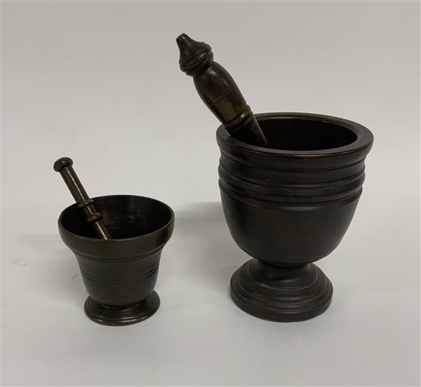 Lotto di due mortai in bronzo con pestello, misure diverse (lievi difetti)