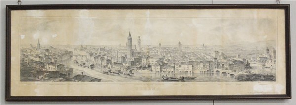 Incisione del secolo XIX raffigurante la veduta di Verona con l’indicazione dei monumenti principali (cm 32x103), in cornice (gravi difetti)