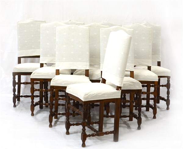 Gruppo di dieci sedie con gambe e traverse a rocchetto, sedute e schienali imbottiti (difetti e restauri)