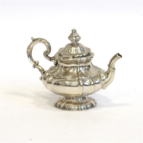 Caffettiera in argento a corpo liscio con bordi in rilievo, ansa sagomata (g lordi 360 ca.) (lievi difetti)