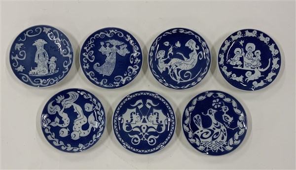 Manifattura Royal Copenhagen. Gruppo di sette piatti da parete in porcellana bi