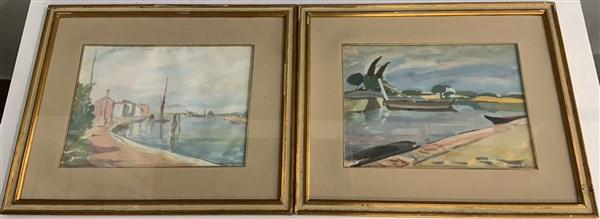 Coppia di dipinti a tempera su cartoncino raffiguranti "Marine" (cm 32x42) Firmati in basso a destra. In cornici
