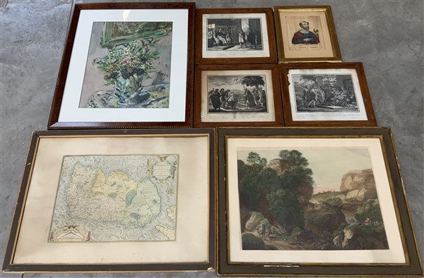 Lotto composto da sette fra incisioni e riproduzioni di soggetto, epoche e misure differenti, in cornici (difetti)