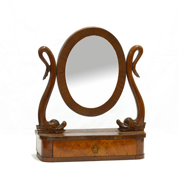 Psiche da tavolo con sostegni a forma di delfino, cassetto nella base, sec. XIX