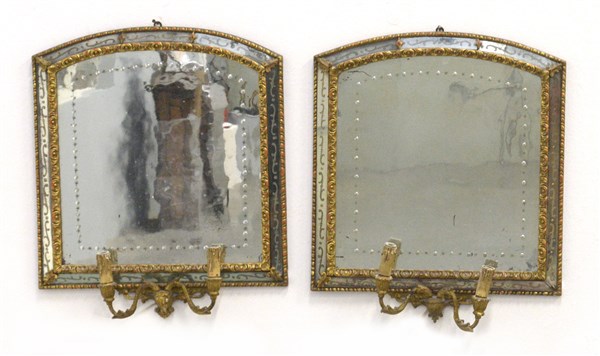 Coppia di specchiere in legno intagliato e dorato, applique a due luci (h cm 62) (difetti e restauri)