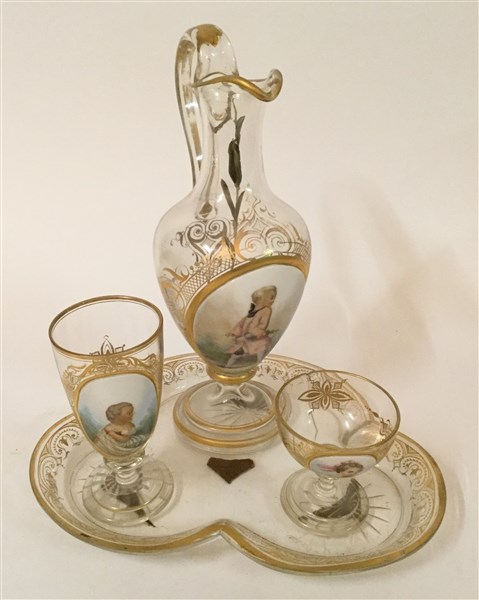 Servizio da notte in vetro decorato a dorature centrato da medaglioni raffiguranti fanciulle, composto da vassoio sagomato, caraffa e due bicchieri diversi (difetti e rotture)