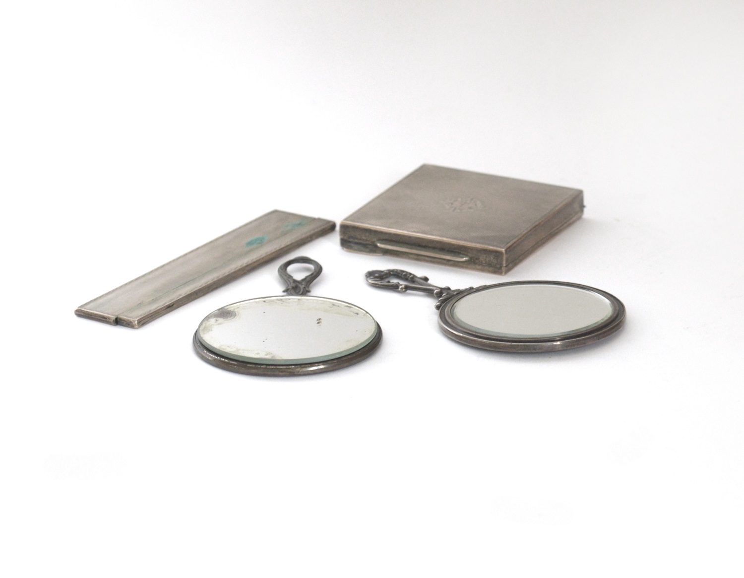 Lotto composto da due piccoli specchi a mano, un portacipria ed un pettine rive