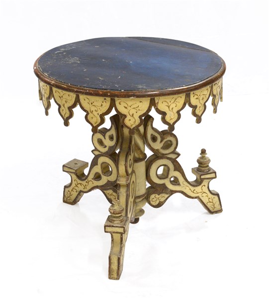 Tavolino tondo in legno laccato avorio e oro, gamba centrale a torciglione con tre piedi sagomati, piano laccato azzurro, sec. XIX (d cm 68x h cm 65) (difetti e mancanze)