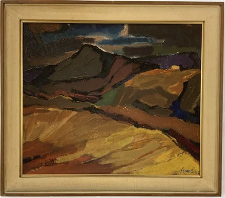 "Paesaggio collinare" olio su compensato (cm 57x67) Firmato e datato in basso a destra. In cornice (difetti)