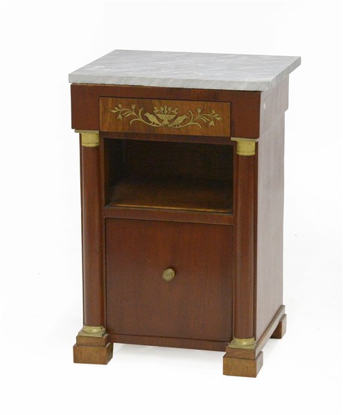 Comodino ad un cassetto ed un'anta con montanti a mezza colonna tornita decorata a capitelli dorati, piano in marmo (cm 44x62x34) (difetti)