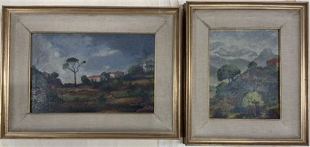 Lotto di due dipinti ad olio su cartone pressato raffiguranti "Paesaggi" (cm 31x47 e 34x27) Firmati in basso a destra; uno dei due datato 1958. In cornici (difetti)