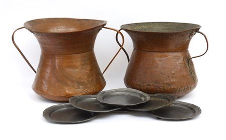 Lotto composto da due paioli in rame e sei piatti in peltro di diverse epoche e