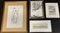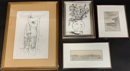 Lotto composto da due incisioni di autori e soggetti diversi, entrambe firmate e due piccoli disegni raffiguranti paesaggi di autore indecifrato
