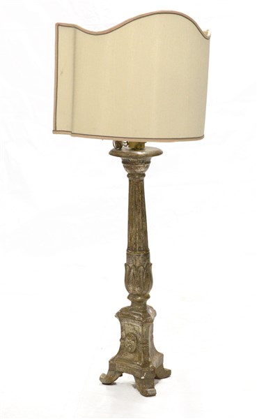 Lotto 2314 | Candeliere in legno intagliato argentato con fusto scanalato con paralume in st
