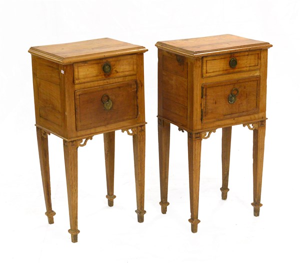Coppia di comodini a gamba alta ad un'anta ed un cassetto. Montanti scanalati (