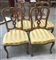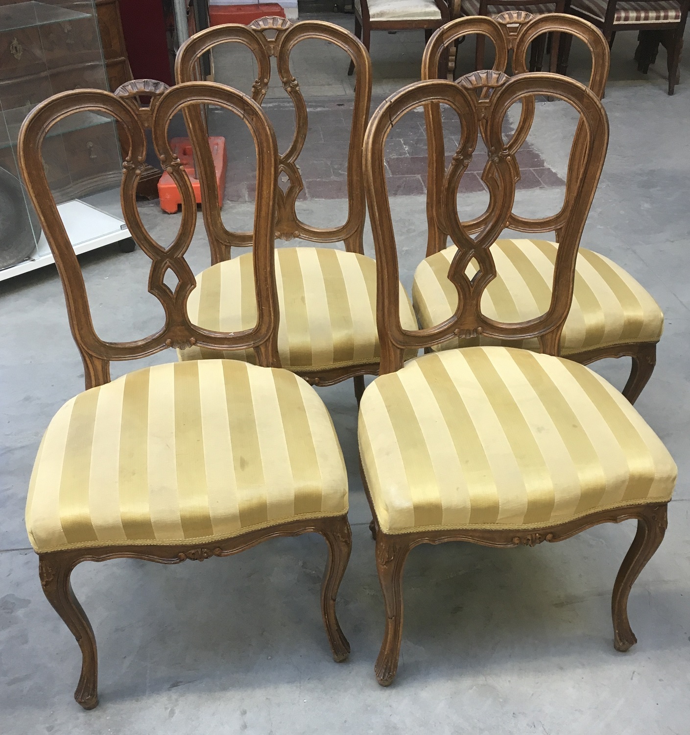 Gruppo di quattro sedie in noce con schienale a giorno a listelli sagomati. Rivestimento in raso "oro" a righe (difetti)