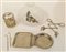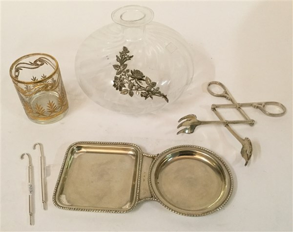 Lotto composto da un vassoietto, una pinza snodabile, due ombrellini sgasatori, un bicchierino ed una bottiglia con decoro floreale in argento, vetro e metallo (lievi difetti)