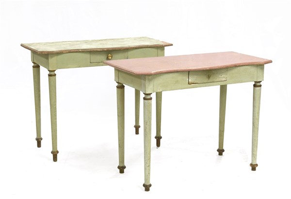 Coppia di tavolini a muro in legno laccato verde, un cassetto sottopiano, gambe tornite. Sec. XIX (cm 104x81x49) (lacca di epoca posteriore, lievi differenze) (difetti)