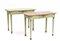 Coppia di tavolini a muro in legno laccato verde, un cassetto sottopiano, gambe