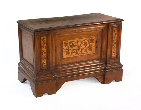 Piccolo cassone con specchiature anteriori intarsiate e filettate, piedi a mens