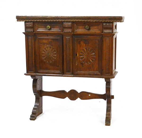 Alzata in legno intagliato a due cassetti e due sportelli con sostegni sagomati