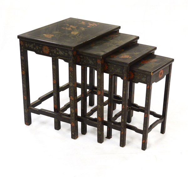 Set di quattro tavolini a nido in legno ebanizzato con decori naturalistici (ch