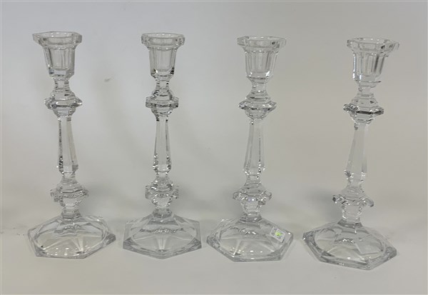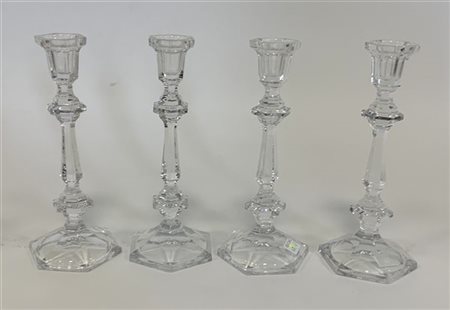 Lotto composto da quattro candelieri in vetro su basi esagonali (h. 26 cm)