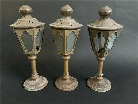 Gruppo di tre fanali da carrozza in ottone e vetro montati a lampade in epoca p