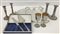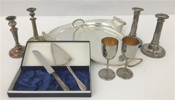 Lotto composto da una coppia di candelieri e due vassoi in metallo argentato uniti a due calici e due candelieri di diversa manifattura e due posate da portata da dolce in metallo e lamina d'argento (difetti)