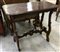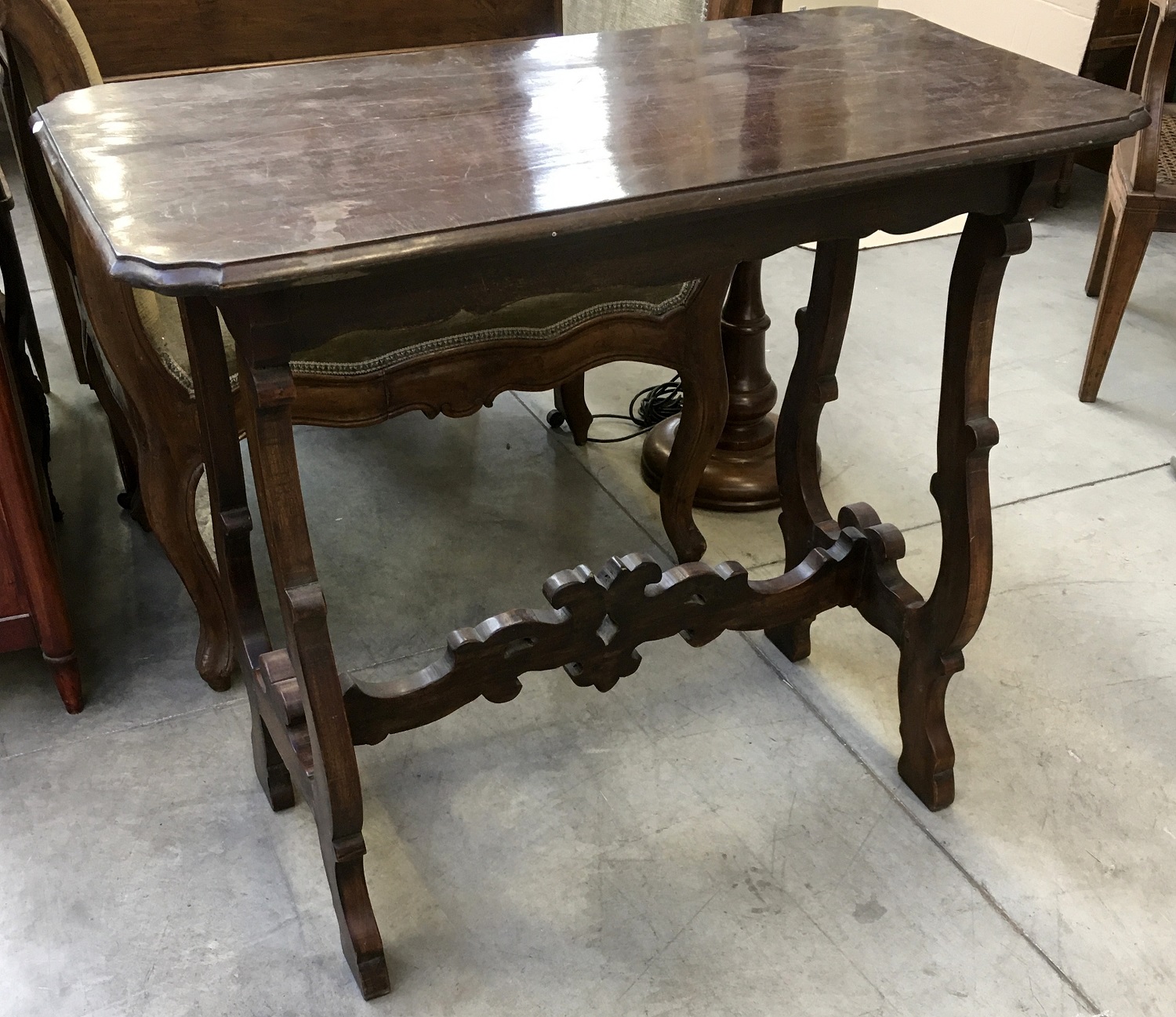 Tavolo fratino con piano rettangolare ad angolo arrotondati, gambe e traverse sagomate e intagliate (cm 90x80x47) (difetti)
