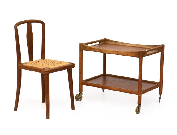 Lotto composto da un carrello portavivande in teak massello e una sedia con seduta in paglia e schienale a giorno (difetti)