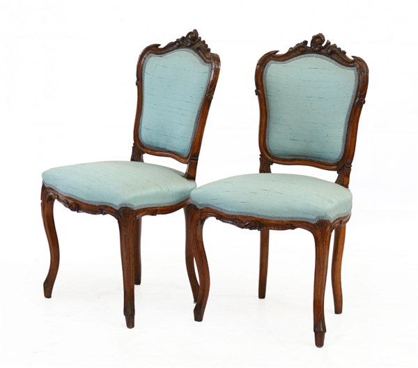 Coppia di sedie in legno intagliato di forma mossa con imbottiture rivestite in tessuto celeste (difetti)